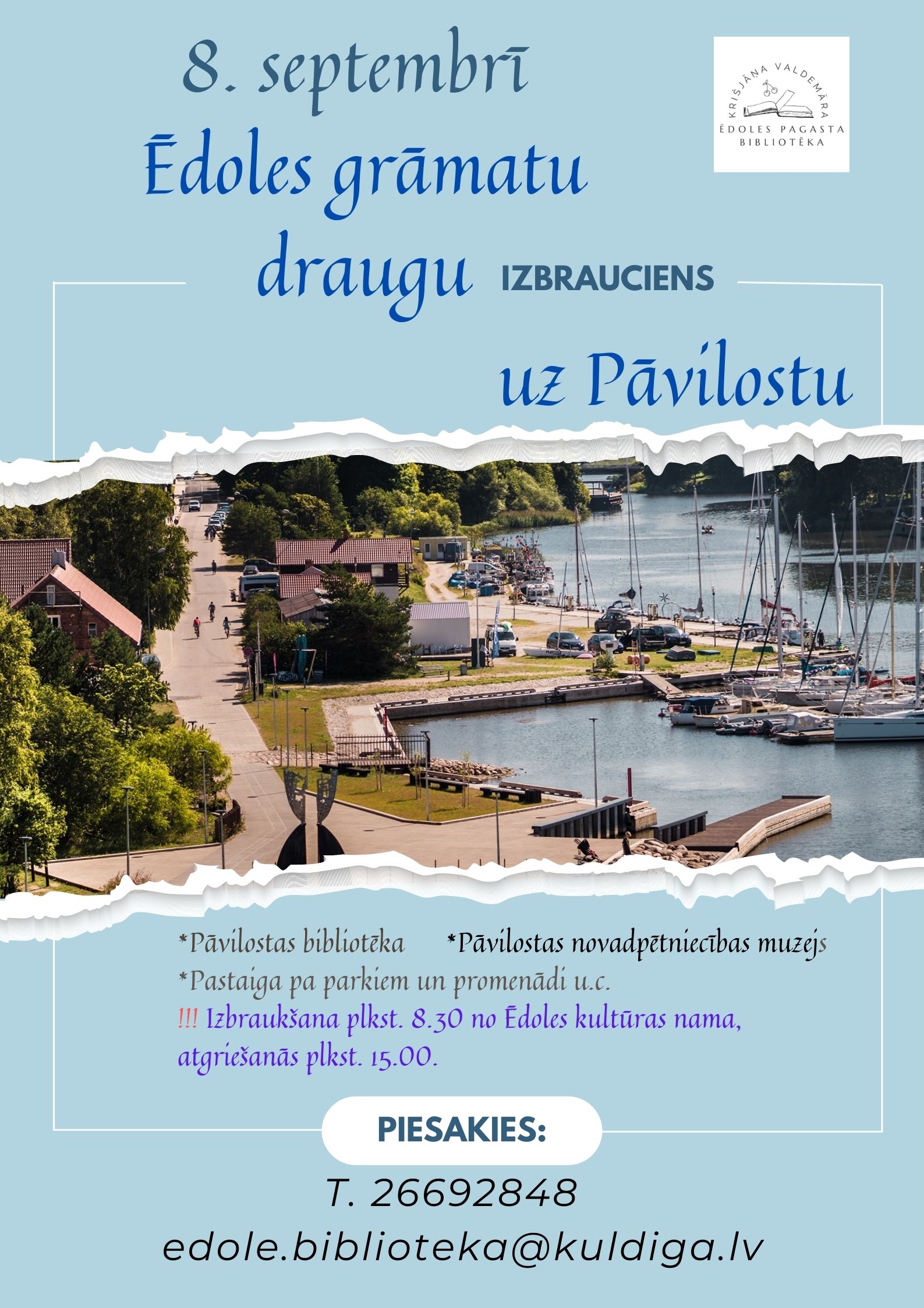 Izbraukšana ceturtdien, 8. septembrī, plkst. 8.30 no Ēdoles kultūras nama. Dosimies iepazīt Pāvilostas bibliotēku, Pāvilostas novadpētniecības muzeju un Laivu māju, lēnā un mierīgā pastaigā pa parkiem un promenādi. Atgriezīsimies Ēdolē plkst. 15.00.
